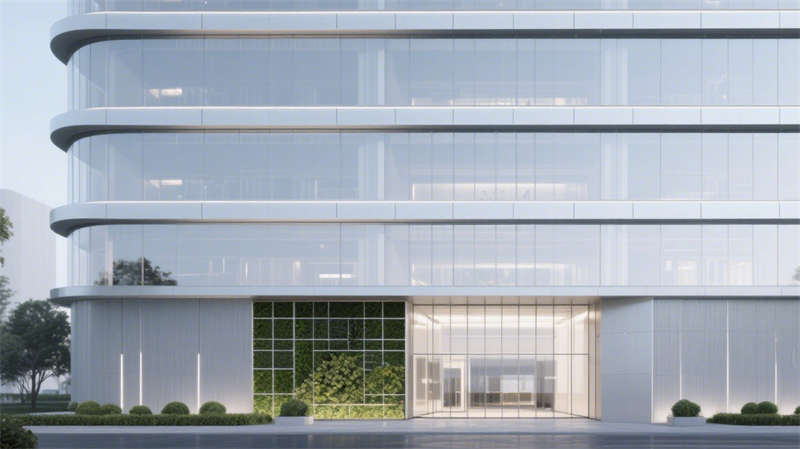 建筑外立面以流線型玻璃幕墻與啞光金屬線條勾勒科技輪廓,底部垂直綠植墻與光伏玻璃的融合,將生態可持續理念嵌入第一視覺印象。通透的挑高入口與室內大堂形成光影聯動,淺白色大理石地面、懸浮式線性燈光與深藍色企業LOGO墻,以克制的色彩系統傳遞品牌調性,同時通過數字屏顯墻實現空間敘事動態化。