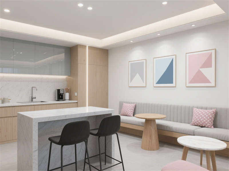 外觀設(shè)計(jì)上,采用淺灰色墻面搭配超白玻璃幕墻,玻璃內(nèi)側(cè)的品牌標(biāo)識(shí)與門(mén)前綠植相呼應(yīng),弱化了建筑的冷硬感,展現(xiàn)出簡(jiǎn)約大氣的辦公形象。進(jìn)入室內(nèi),前臺(tái)接待區(qū)以淺灰與米白為基礎(chǔ)色調(diào),L型前臺(tái)搭配柔和燈光,等候區(qū)的布藝沙發(fā)與原木元素結(jié)合,給訪客帶來(lái)溫和專(zhuān)業(yè)的第一印象。?