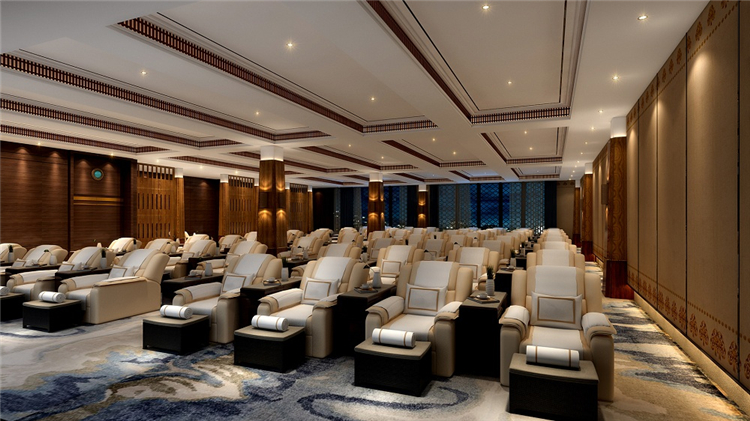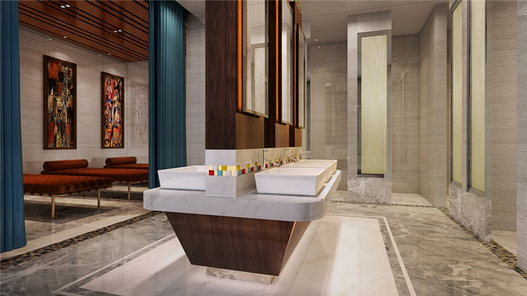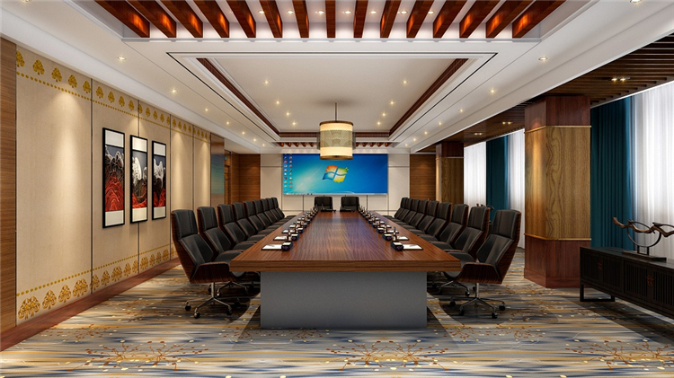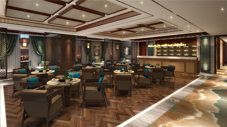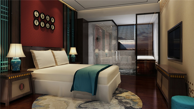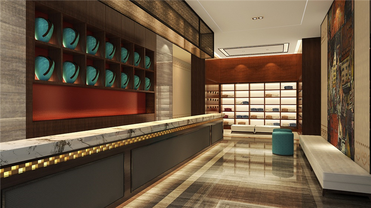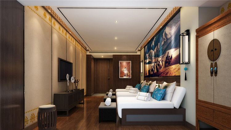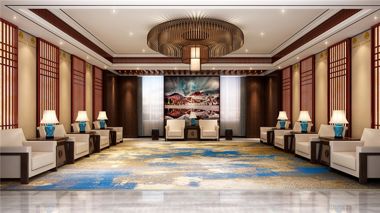 設(shè)計師同時考慮到地域民族文化和功能實用性,結(jié)合現(xiàn)代簡約與傳統(tǒng)藏式風(fēng)格,為往來的游客提供一個放松休憩的完美場所。設(shè)計師主要運用藏藍(lán)、金黃、喇嘛紅等濃重色彩進(jìn)行搭配,靈感既來自于藏族傳統(tǒng)文化及宗教藝術(shù),也來自于雪域高原山高天藍(lán)水長花艷的自然景觀。借用柱網(wǎng)結(jié)構(gòu)、幾何紋路、吉祥花等藏式建筑形式和圖案進(jìn)行裝飾和點綴,但將繁復(fù)的式樣盡量精簡平面化,取其古樸、神奇、粗獷的神韻,表達(dá)一種平衡、對比、和諧統(tǒng)一的構(gòu)圖規(guī)律和審美思想。