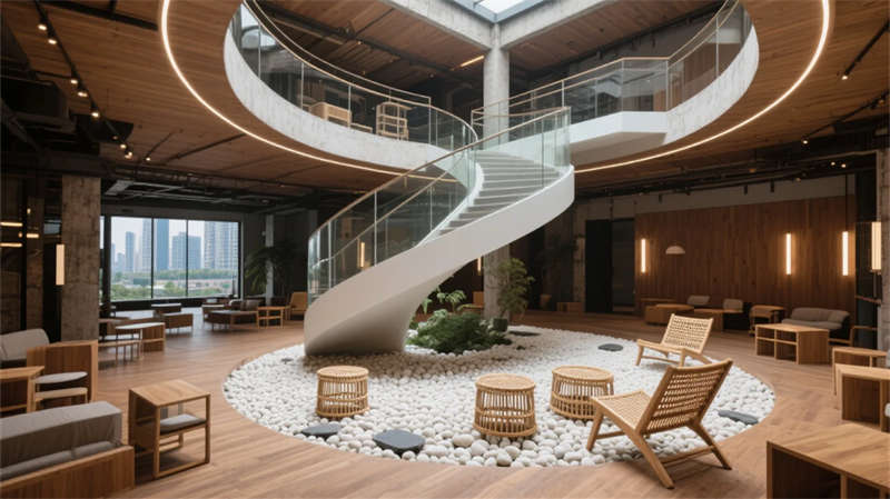 開放式核心區采用模塊化家具系統,配合智能照明與聲學優化,兼顧協作效率與專注需求;階梯沙龍與透明會議盒子激發即興創新,可移動隔斷實現場景自由切換。最具特色的是貫穿三層的垂直生態中庭,旋轉樓梯纏繞常綠藤蔓,成為連接空間的活力紐帶。