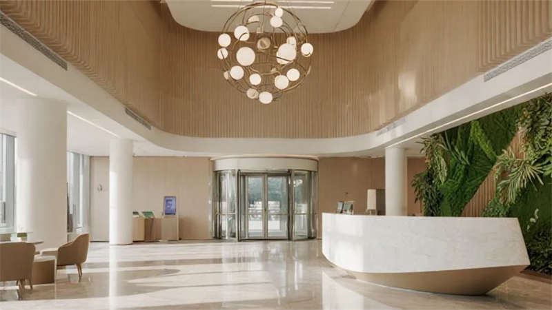 本設計以現代簡約美學重構辦公空間本質,建筑外觀采用純凈的玻璃幕墻與幾何切割形體,在晝夜交替中演繹光與影的韻律。入口大廳通過挑高空間與弧形前臺營造開放包容的儀式感,綠植墻與球形燈具的點綴賦予空間自然生機。電梯間延續極簡語言,香檳金金屬與巖板材質碰撞出低調質感。