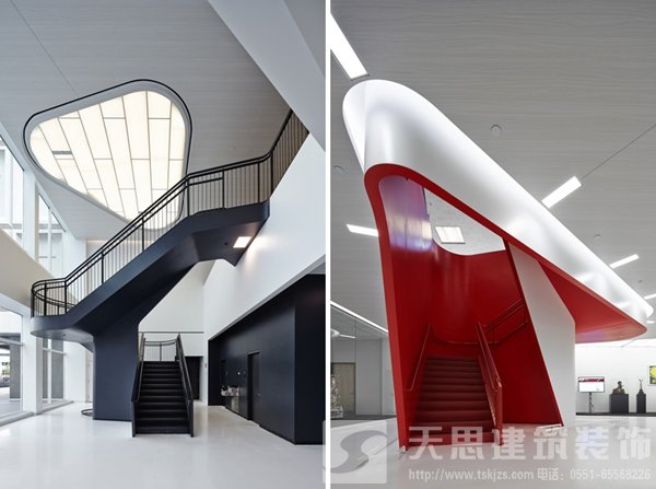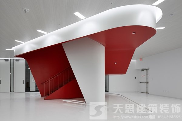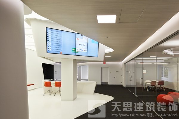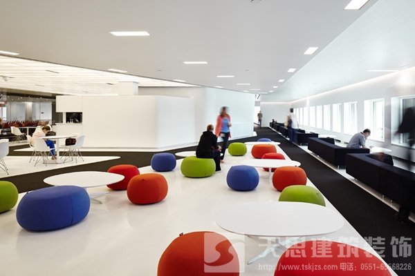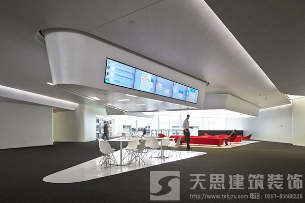 綜合大樓過渡區(qū)設(shè)計為開放式合作工作區(qū)域,傳統(tǒng)的理念通常認(rèn)為這里和工作場所相比不是那么有用,但是很多富有成效的非正式的討論往往在這里誕生。每個工作中心都配有色彩鮮明的家具,頂部下方挑檐底面突出的吊頂造型內(nèi)嵌LED顯示屏,不斷滾動播出最新信息,包括各種通知、員工和訪客新聞、各種公告、新聞事件以及全球3M公司員工信息。