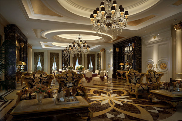 玄關、大堂、客廳都選用具有歐式風格的水晶吊燈、羅馬柱和花崗巖地磚,客廳桌椅則選用搭配經典歐式的茶幾。