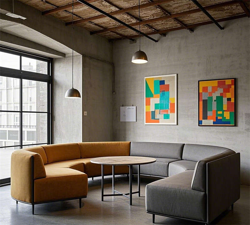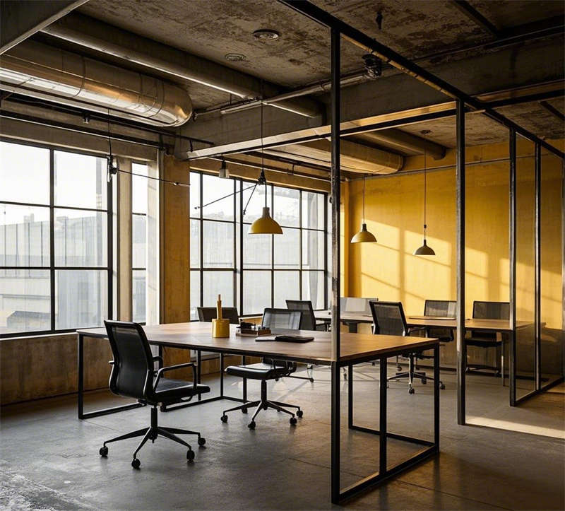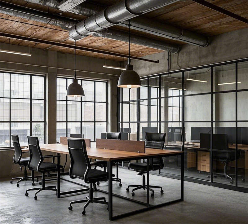 前臺接待區以深色木質桌和皮質沙發為主,搭配暖色調燈光和綠植點綴,既保留了工業風的硬朗,又增添了溫馨感。開放式辦公區采用金屬支架桌和玻璃隔斷,既保證了空間的通透性,又提升了工作效率。會議室和經理辦公室則通過深色木質家具和落地窗設計,凸顯出高端與穩重。休息區和茶水間以舒適的皮質沙發和金屬吧臺為亮點,為員工提供了放松和交流的空間。創意討論區則通過不規則家具和白板墻激發靈感,而電話間則以玻璃隔斷和隔音設計保障了隱私需求。整體設計在保留工業風原始質感的同時,注重功能性與舒適性的平衡,打造了一個既實用又充滿個性的辦公環境。