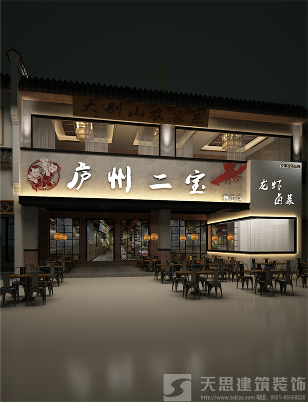 店面裝修設計:麻辣蝦幾個大字和龍蝦圖形,讓客戶清楚的看到本店的主營業務,小空間大介紹,目的就是為了突出餐飲店的介紹,主次分明,是設計中的重要一環。