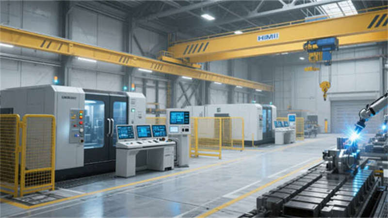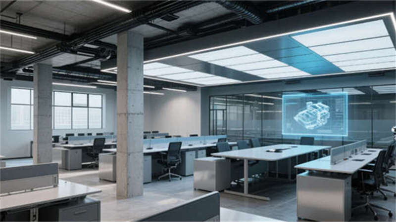 核心生產(chǎn)區(qū)以灰調(diào)環(huán)氧樹脂地坪為基底,大型CNC加工中心與智能機(jī)械臂組成“U”型產(chǎn)線,頂部集成黃色安全標(biāo)識的橋式起重機(jī)軌道,配合藍(lán)光焊接機(jī)器人動(dòng)態(tài)光軌,形成極具未來感的工業(yè)圖景。辦公區(qū)突破傳統(tǒng)廠房設(shè)計(jì),通過混凝土肌理墻面、懸浮式玻璃會(huì)議艙及企業(yè)色聲學(xué)模塊,構(gòu)建開放互聯(lián)的智慧管理中樞。