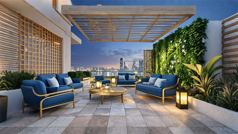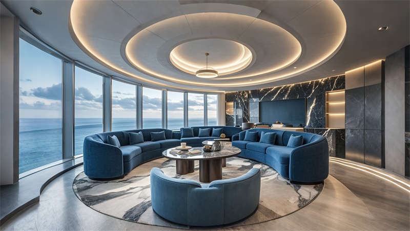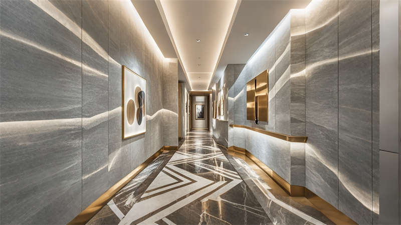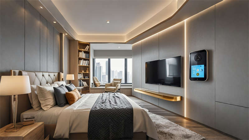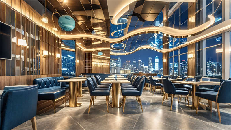 色彩體系以香檳金與深海藍為主調,大堂采用香檳金金屬線條勾勒建筑肌理,搭配深海藍大理石營造視覺重心。客房區(qū)運用暖灰硬包墻面平衡色彩強度,通過2700K暖光與4000K中性光分區(qū)照明塑造晝夜場景。材質組合注重層次:大理石地面、金屬構件、絨布軟包形成質感三部曲。