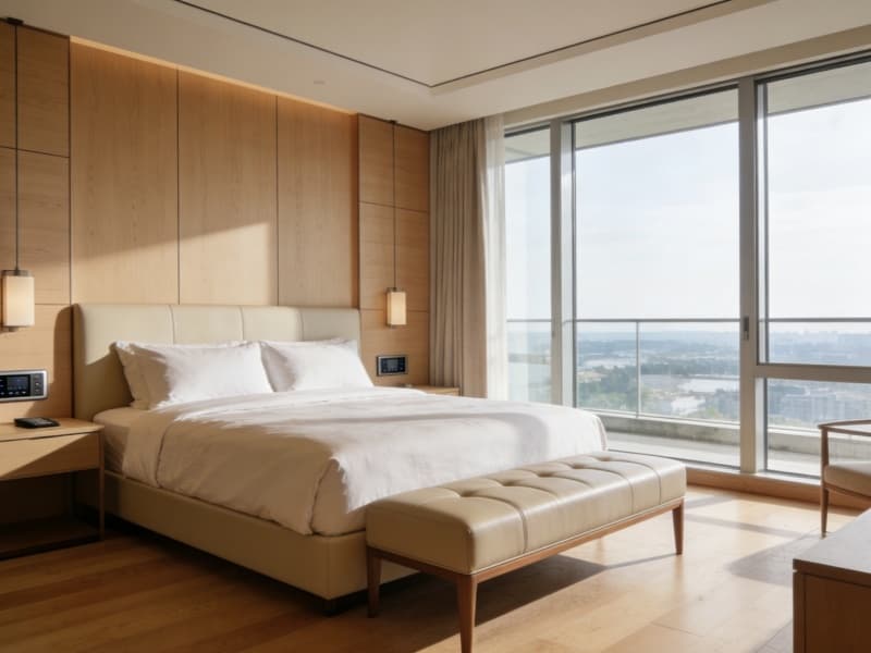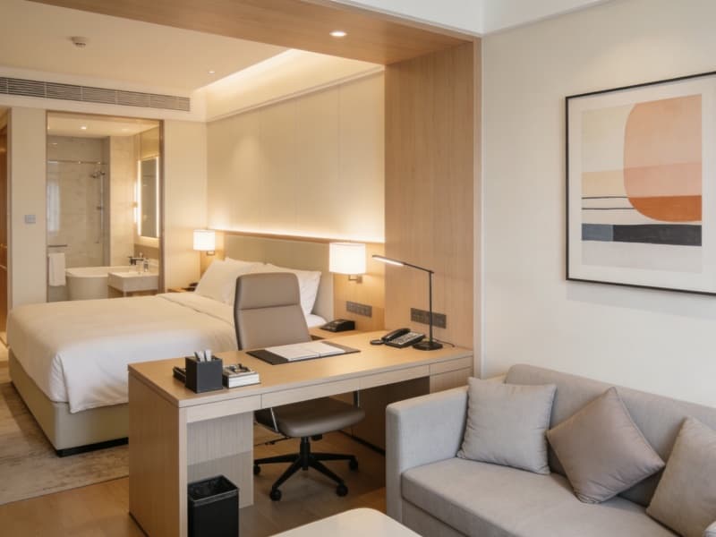 二至四層為住宿層,規劃約80間客房,包括豪華房、行政房等房型。客房以淺木色為主調,搭配真皮軟裝與柔和燈光,營造溫馨氛圍。每間客房均配備智能客控系統,方便客人操作。
