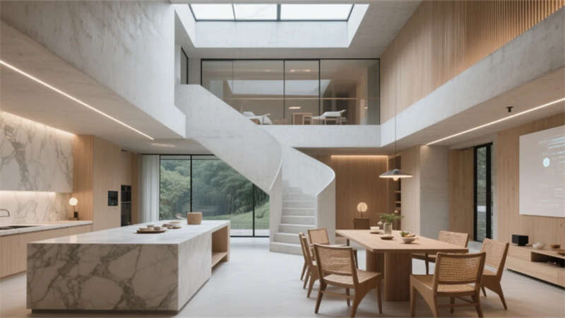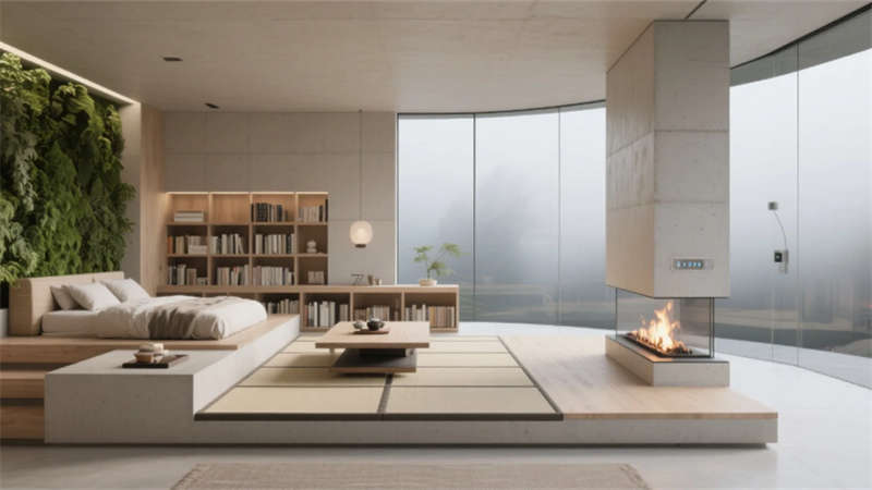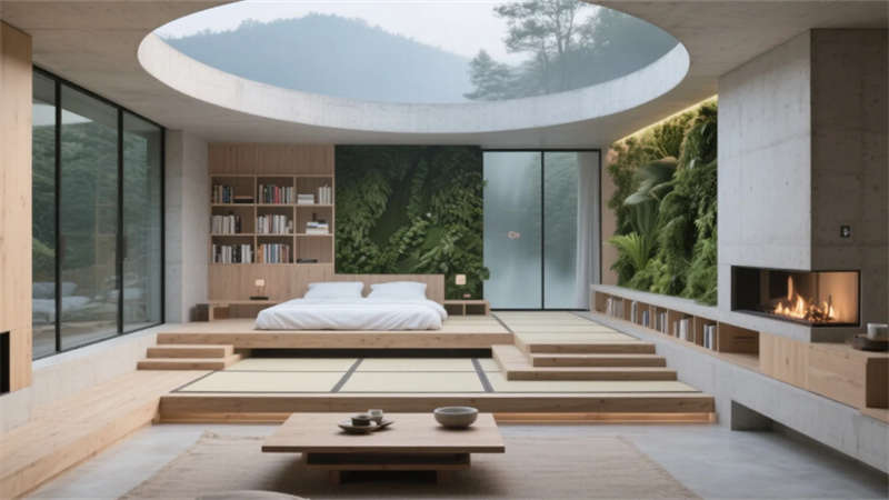 客房以極簡的智慧回應棲居本質。榻榻米地臺消弭床與地面的界限,270°環(huán)景霧化玻璃輕觸即透,仿生綠植在智能光影中呼吸生長,隱藏式投影幕布落下時,星空與林海皆成私享背景。階梯書吧的垂直綠植墻下,模塊化沙發(fā)隨需求自由組合,全息粒子在空氣中勾勒出流動的藝術,而巖板中島餐廳里,藤編座椅與吊燈矩陣的光暈交織,智能調光天窗讓每一餐都浸染著天光的溫度。