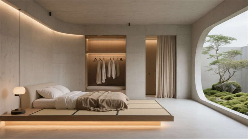 空間敘事聚焦材質(zhì)本真:微水泥地面延伸視覺縱深,懸浮式家具營(yíng)造失重趣味,線性光帶引導(dǎo)行為動(dòng)線。功能分區(qū)借由光影游戲自然過渡,下沉客廳銜接無界餐廚,榻榻米臥室推窗即見苔蘚庭院,頂樓露臺(tái)用透明邊界消融城市天際線。