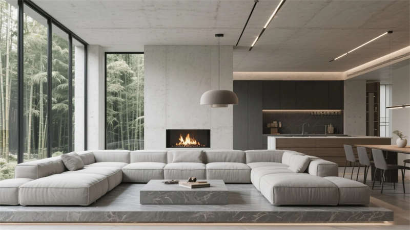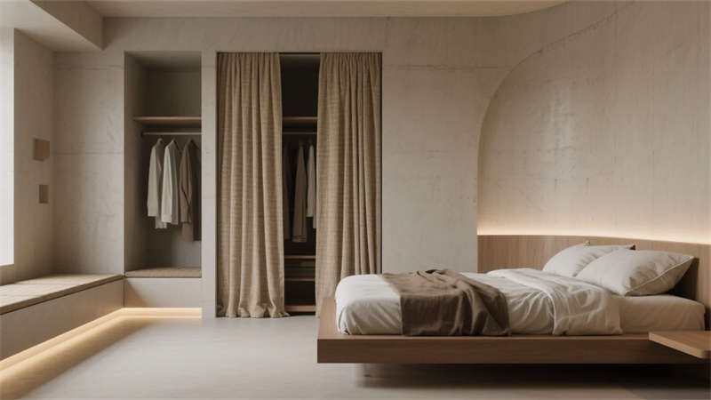 衛(wèi)浴空間化身立體水景容器,鏡面天花反射青石浴缸與垂吊綠植,形成虛實(shí)交織的自然劇場(chǎng)。所有構(gòu)件皆服務(wù)于居者與環(huán)境的對(duì)話,混凝土墻體在晨昏光線中呈現(xiàn)不同肌理,定制家具的圓弧收邊柔化現(xiàn)代主義的冷冽。