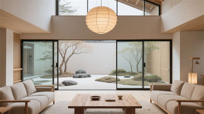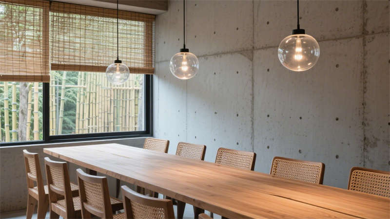本設計以自然與現代的融合為核心,延續了原木、玻璃與清水混凝土的材質語言,將合肥地域的溫潤氣質與侘寂美學相呼應,打造出兼具舒適感與藝術感的居住場景。公共區域中,淺橡木色的柜體與天花線條連貫延伸,搭配通透的玻璃隔斷,讓光線自由穿梭,模糊室內外的邊界;清水混凝土墻面保留了原始肌理,與苔蘚綠的軟裝陳設形成柔和對比,傳遞出質樸而寧靜的氛圍。?