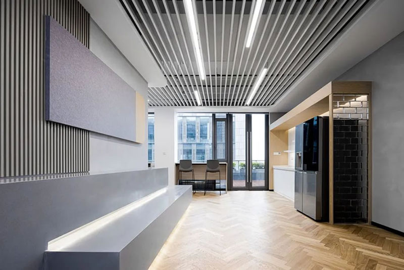 茶水間/接待室滿足內(nèi)外需求,最大化利用空間節(jié)約置地成本。訪客拜訪和員工自用的區(qū)域,與工作區(qū)域動(dòng)靜分離,高桌形式的座位滿足員工就餐、休憩放空的需求。