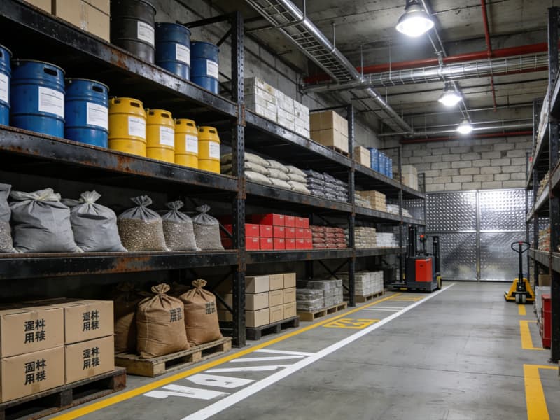 原料存儲區設置多層式的金屬貨架,方便分類存放不同原料,提高空間利用率。區域間通過清晰的標識線進行劃分,保障物流運輸的順暢。