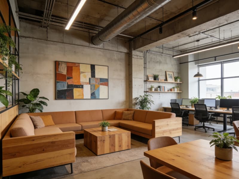 員工休息區,以暖色調的木質家具搭配柔軟的沙發,墻面掛飾一些藝術畫,綠植點綴其中,為員工提供舒適放松的環境,緩解工作疲勞。