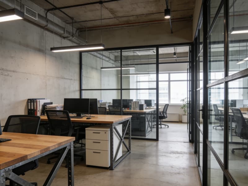 辦公區延續工業風格,辦公桌選用金屬框架搭配木質桌面,文件柜簡約實用。通過玻璃隔斷劃分不同的辦公區域,既保證獨立空間,又不影響整體通透感。