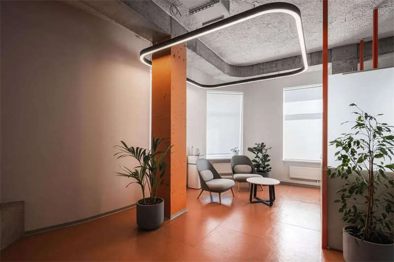一種是沿辦公室周邊設置了一圈燈帶,燈光從白色天花板上反射出來,散發出令人賞心悅目的溫暖漫射光。還有一種線性照明形式呼應流線型的建筑輪廓,將整個辦公室從入口區域連接到行政工作區。另一個這樣的設計元素出現在廚房區,當陰天自然光不足時可以照亮這里的空間。此外,每組工位都有一個獨立光源,如有必要,每個員工都可以自行打開或關閉。