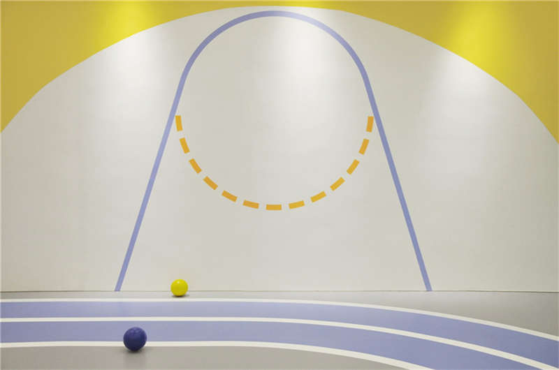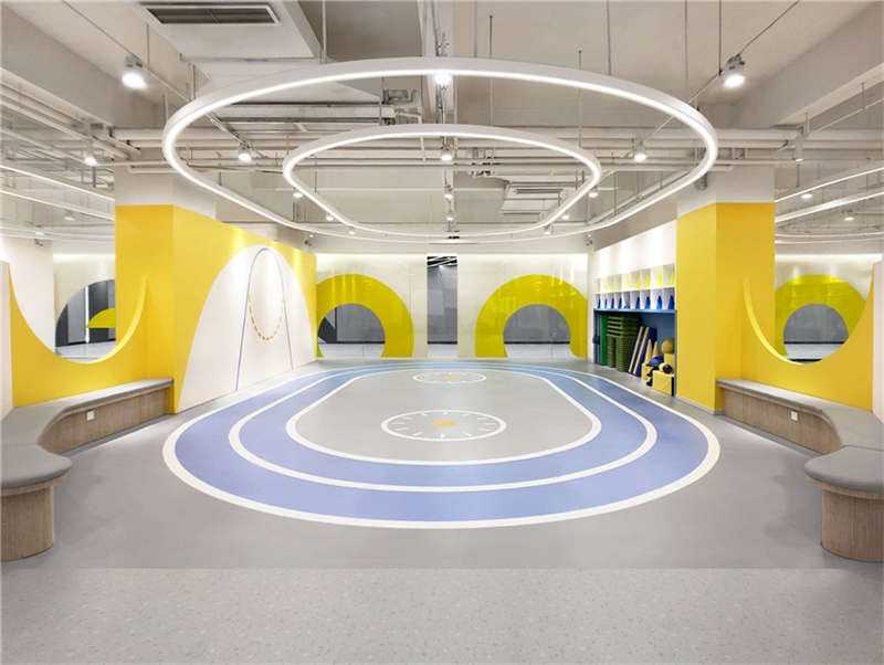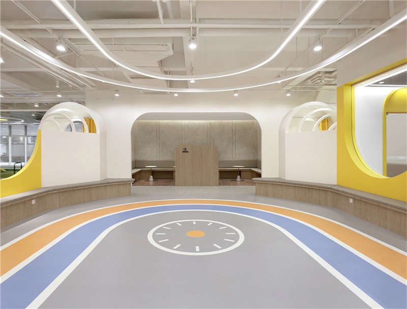 利用樓宇的縱向夾角空間,層層疊出的形象是進入星球的能量加速器。地上的黃色跑道是孩子們丈量自己成長的T臺,每個小朋友通過跑道后都擁有更強的生命力。緊鄰接待區(qū)的泡泡池是迎接孩子們的歡樂地,背后的鏡面構(gòu)筑了游離在現(xiàn)實與夢境之間的界限,折射出孩子更加廣闊的天空,讓能量加倍!