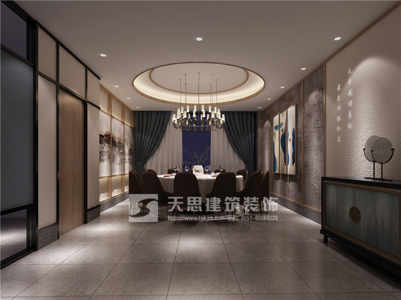 圓柱吊燈、墻壁刻字、墻壁上的國畫、餐具的擺放,一切的一切相互融合起來,形成一個優質的就餐環境,在這里讓客戶感受到不一樣的就餐氛圍。