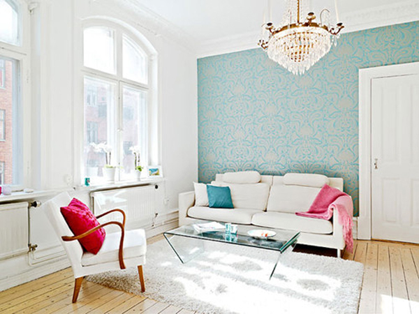 在華麗的水晶燈的照耀下,白色的北歐客廳裝修設計顯得清新亮麗,輕盈的塑料茶幾在柔軟的地毯上放縱的舞蹈,彩色的靠枕和墻紙是北歐客廳裝修的唯一色彩,藍花的壁紙烘托出北歐客廳的溫馨氣氛。