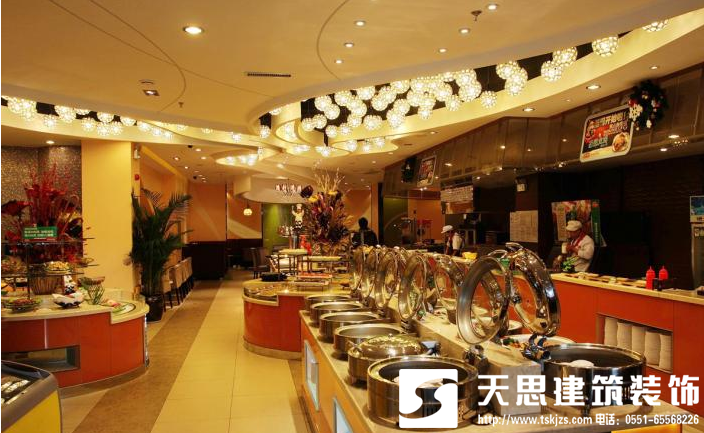 自助餐廳的形式是多元化的,中式與西式之間、主題與主題之間的不同對餐臺的布置要求也是各異的,可塑性非常高。合肥天思裝飾公司有著十幾年專業的餐飲飯店設計裝修經驗,可以為您提供免費專業的前期咨詢服務,電話:0551-65568226。