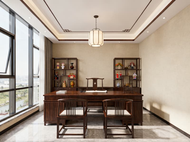 空間布局上,科學劃分開放辦公區、獨立辦公室、會議室、休閑區等功能區域,優化動線設計,保證辦公效率與使用舒適度。色彩以淺色系為基底,搭配深棕色實木元素,營造雅致、沉穩的視覺效果,同時通過落地玻璃窗、中式格柵吊燈等設計引入充足自然光線,減少空間壓抑感。
