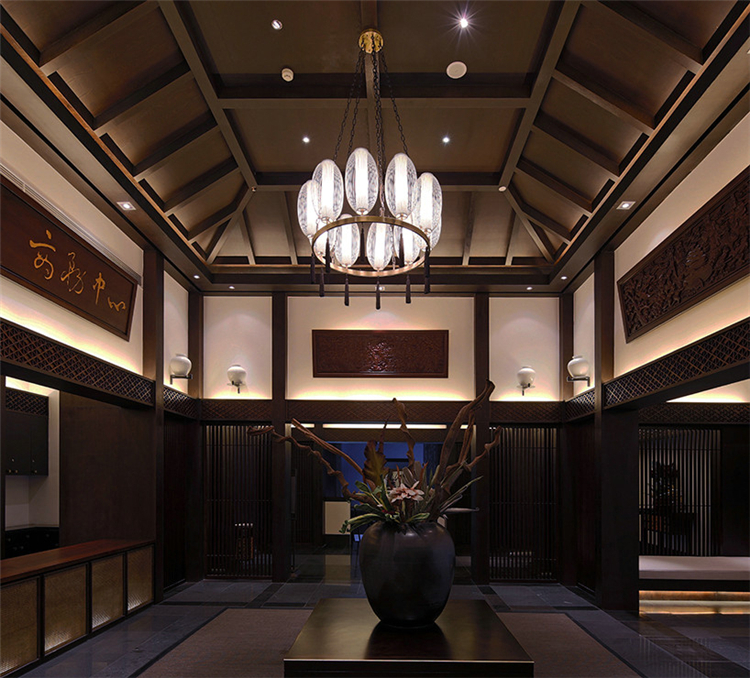 走入大堂,室內空間寬闊,天花鱗次櫛比通向樓梯方向,墻面灰色石材雕刻,將桃花源記中的詩句映入客人眼簾,禪境古意撲面而來。鏤空屏風隔墻的設計,讓空間隔而不斷,與具有傳統韻味的家具和配飾相互交融,打斷俗世的紛擾。柱子和天花上的裝飾燈具,利用金屬和木材兩種截然不同的材料和質地,創造空間內在張力,透過銳利的金屬、細膩的木質線條強調空間結構,精致筆挺的吊燈,令空間由內向外展現獨特魅力。