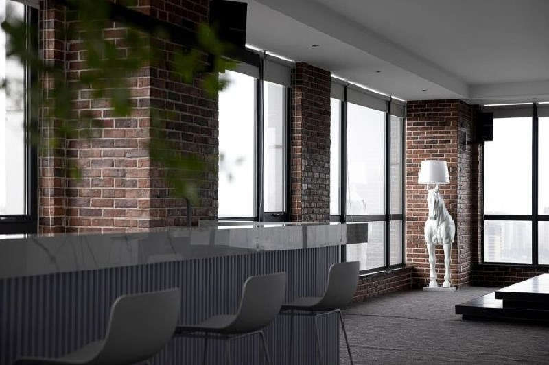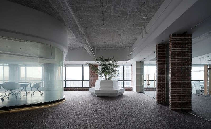 經劃分,原本四方的整體空間,大致可歸為公共辦公區、獨立辦公室、黨建室、互動區、財務室、會議室、儲藏室、休閑室、檔案室及其他功能區域。拋去濃烈的墨黑,以灰、白作主色調,既保持了沉穩、大氣的理智感,又不使氣氛過于肅靜。前臺加入金色提亮,搭配大理石的紋理質感,活波間亦不落俗,凈土之上雅致盡顯。在簡約現代的輕工業氛圍下,色彩、裝飾往往點到為止。紅磚墻與藤編椅的原生感,質樸、不造作,在一片素雅的環境中,如曇花輕綻,為空間注入悄無聲息的生命力。