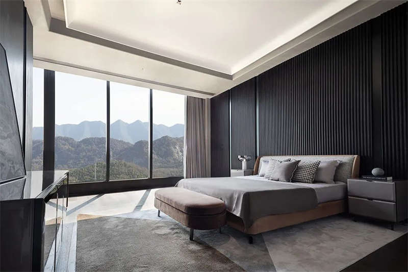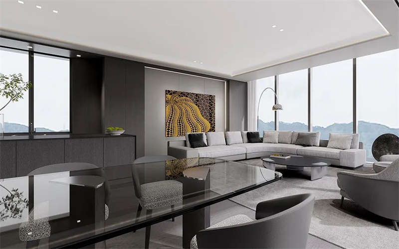 流暢的樓梯設(shè)計手法貫穿縱向空間,一氣呵成。黑白雙層欄桿扶手、無縫樹脂地坪和極具設(shè)計感的線性燈帶,把這種極致簡約的設(shè)計風(fēng)格伸延到整個空間。