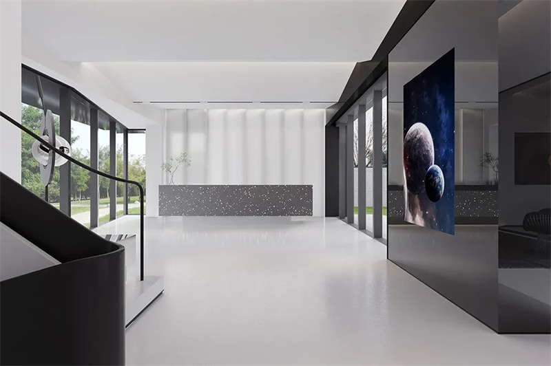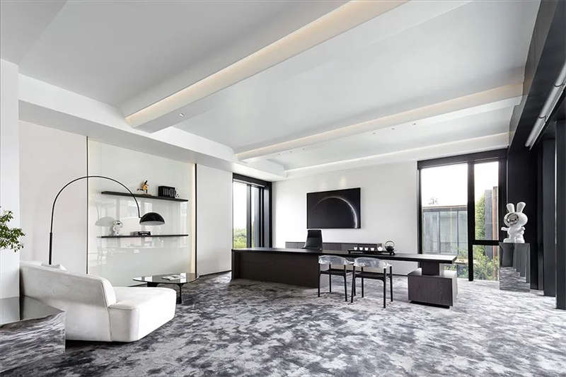 一層前臺,以黑白創(chuàng)作出一個極致簡潔的空間,兩側(cè)落地開窗實現(xiàn)無限延伸,空間的邊界更加柔軟,內(nèi)庭院成為接待區(qū)的裝飾景觀,前臺及背景以“帆”這一意象表達(dá)對于宇宙世界探索的起航。樹脂地坪的無接縫特性解決了材質(zhì)拼接的繁瑣,讓空間更加純粹簡潔。