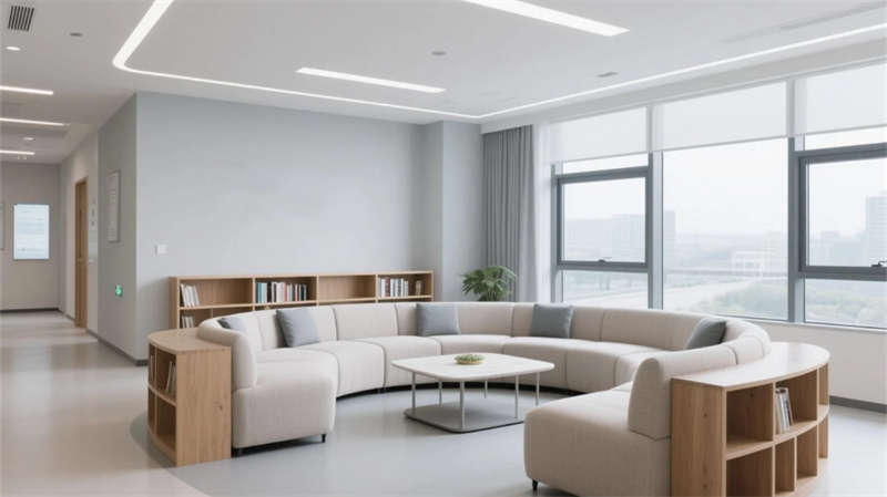 該社區(qū)醫(yī)院設(shè)計以現(xiàn)代簡約理念為核心,營造出溫馨而高效的醫(yī)療環(huán)境。整體空間強調(diào)人性化布局,接待大廳寬敞明亮,弧形接待臺與自然光結(jié)合,營造親切的第一印象。候診區(qū)舒適寧靜,沙發(fā)與書架的點綴減輕等待焦慮,診室則注重隱私與專業(yè)感,柔和色調(diào)提升患者信任。藥房設(shè)計簡潔清晰,便于快速取藥,急診室布局高效,確保緊急響應(yīng)流暢。化驗室和影像科突出功能性,無菌環(huán)境與設(shè)備集成保障精準(zhǔn)診療,康復(fù)區(qū)開放通透,綠植與自然光促進身心恢復(fù)。所有區(qū)域統(tǒng)一運用中性色調(diào)、木質(zhì)元素和流線型家具,強化視覺連貫性,同時融入充足采光與綠意,打造舒緩氛圍。設(shè)計不僅提升醫(yī)療體驗,還呼應(yīng)了合肥的城市人文特色,為居民提供一處安心、便捷的健康港灣。